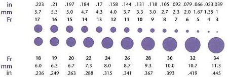The French Scale is commonly used to measure the diameter of the catheter. As the scale below illustrates, 1 Fr = .33mm; therefore, in order to determine the diameter of a catheter in mm, simply divide the Fr by 3. For example: 12 Fr / 3 = 4 mm.