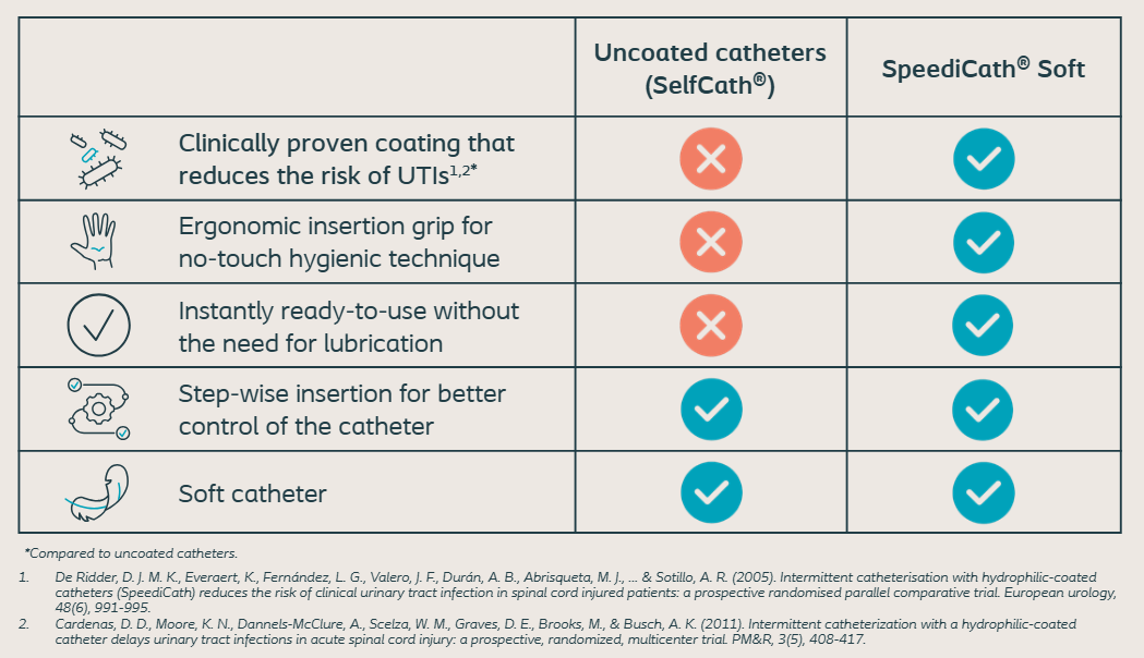 Instantly Ready-to-Use: SpeediCath® Soft features a hydrophilic coating (Triple Action Coating TechnologyTM) that is clinically proven to help reduce the risk of urinary tract infections (UTIs)*1,2 and is ready for use without the need for lubrication.